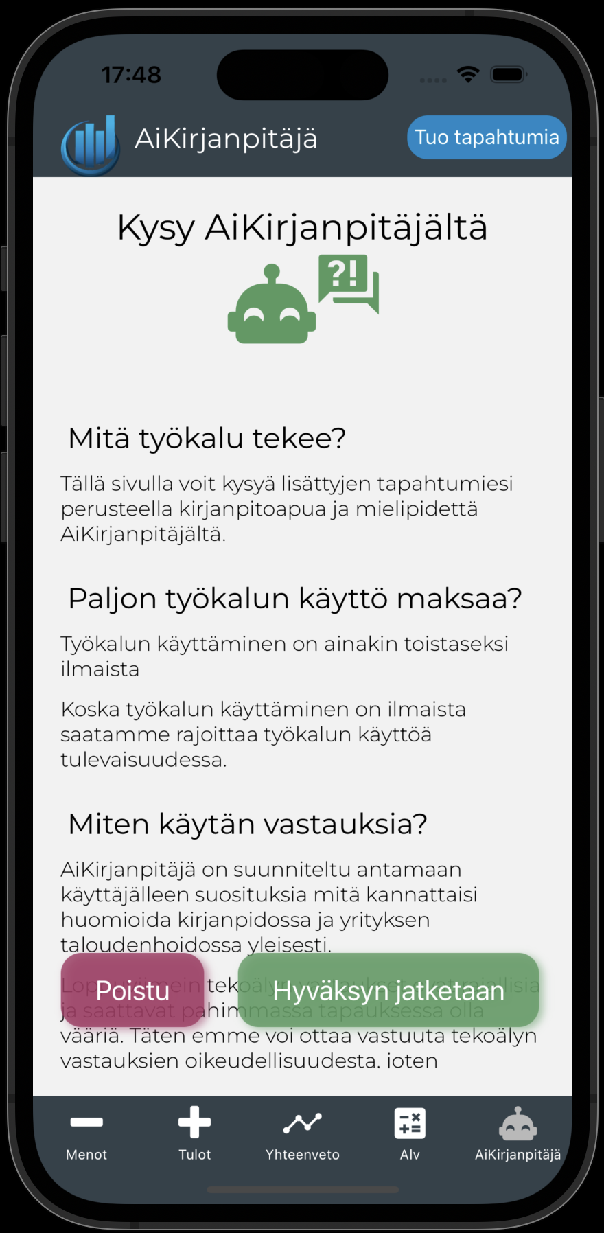 AiKirjanpitäjä kehitettiin alunperin mikroyrityksien avuksi kirjanpitoon. Sovelluksessa voi lisätä omat tulo-, meno- ja alvtapahtumat jotka yhdistetään antamiisi taustatietokysymyksiin joiden pohjalta tekoäly antaa sinulle analyysin yrityksesi taloudellisesta tilanteesta ja mahdollisia suosituksia.